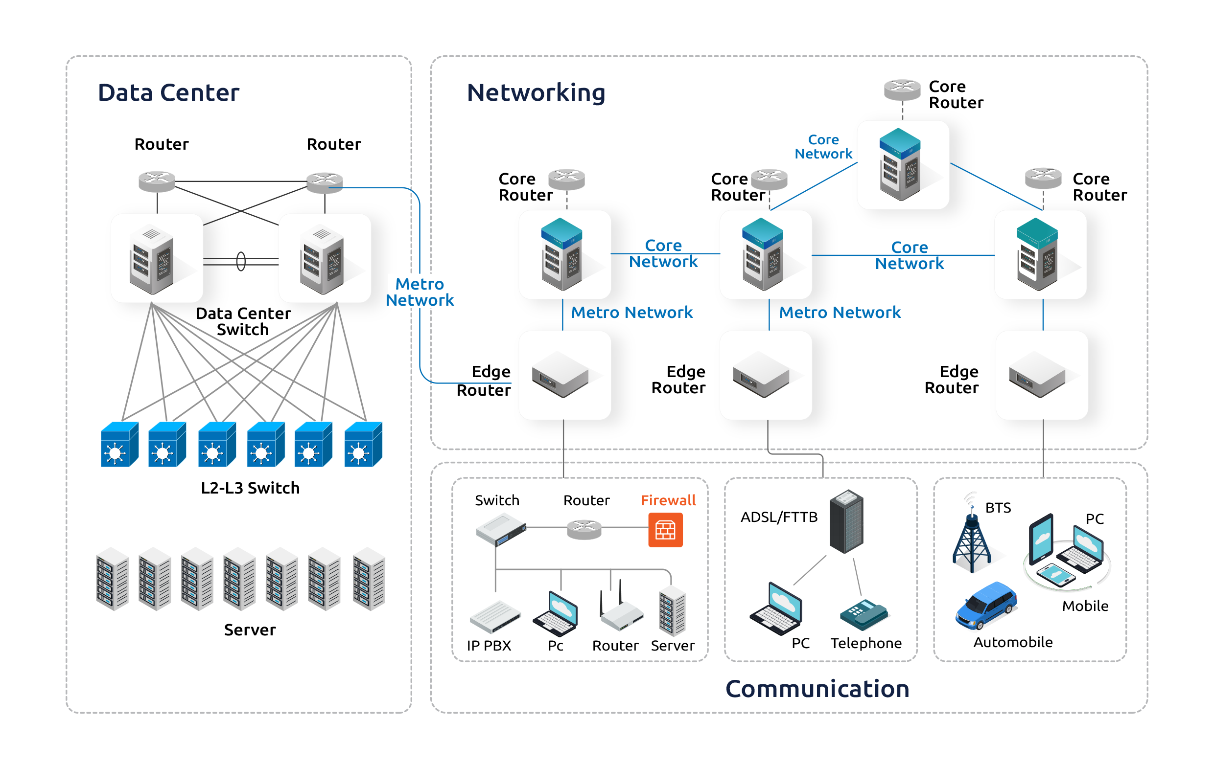 ให้คำปรึกษา ออกแบบ ติดตั้ง และจำหน่ายผลิตภัณฑ์และอุปกรณ์ที่เกี่ยวข้องกับระบบเครือข่ายโครงสร้างพื้นฐาน ทั้งเครือข่ายระยะใกล้ (LAN) เป็นเครือข่ายในการส่งสัญญาณภายในองค์กรที่อยู่ในอาคารหรือพื้นที่เดียวกัน และเครือข่ายระยะไกล (WAN) ซึ่งเป็นเครือข่ายที่ทำหน้าที่การเชื่อมโยง ผ่านเครือข่ายที่มีระยะทางไกลอยู่คนละพื้นที่