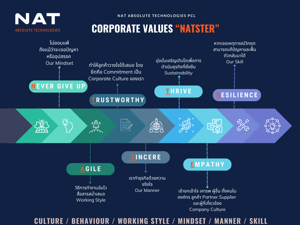 เราดำเนินธุรกิจด้วยความมุ่งมั่นและเติบโตอย่างต่อเนื่องมุ่งเน้นสร้างรากฐานธุรกิจให้มั่นคง เพื่อสร้างผลงานที่ดีที่สุดให้แก่ลูกค้าเพื่อพัฒนาบุคลากร ที่มีศักยภาพ และเพื่อสร้างผลตอบแทนให้กับผู้ถือหุ้น โดยคำนึงถึงสิ่งแวดล้อม ชุมชนและสังคมไปพร้อมๆกัน